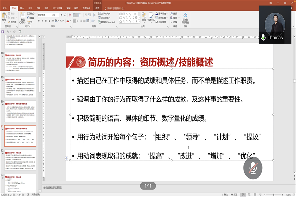 关于就业准备方面,杨璐提醒大家要及时查看公司和公司为大家提供的就业信息,并结合自身经历,向大家介绍了简历制作的技巧、标准与重点事项,鼓励大家丰富简历内容、注意关键信息,增强简历与岗位之间的契合性、关联性。最后,杨璐希望大家在面对求职中的迷茫与困惑时,能够将自身性格、兴趣与技能与岗位机会进行匹配,以更加合理的职业规划迎接人生中的机遇与挑战。