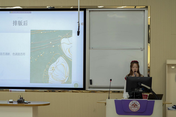 王瑶从排版顺序、排版过程、排版的基本原则几个方面,向大家介绍了排版的技巧。排版前、中、后分别应该做什么;对比、重复、对齐、亲密、颜色、留白几大原则等,都深深地留在了同学们的脑海里。