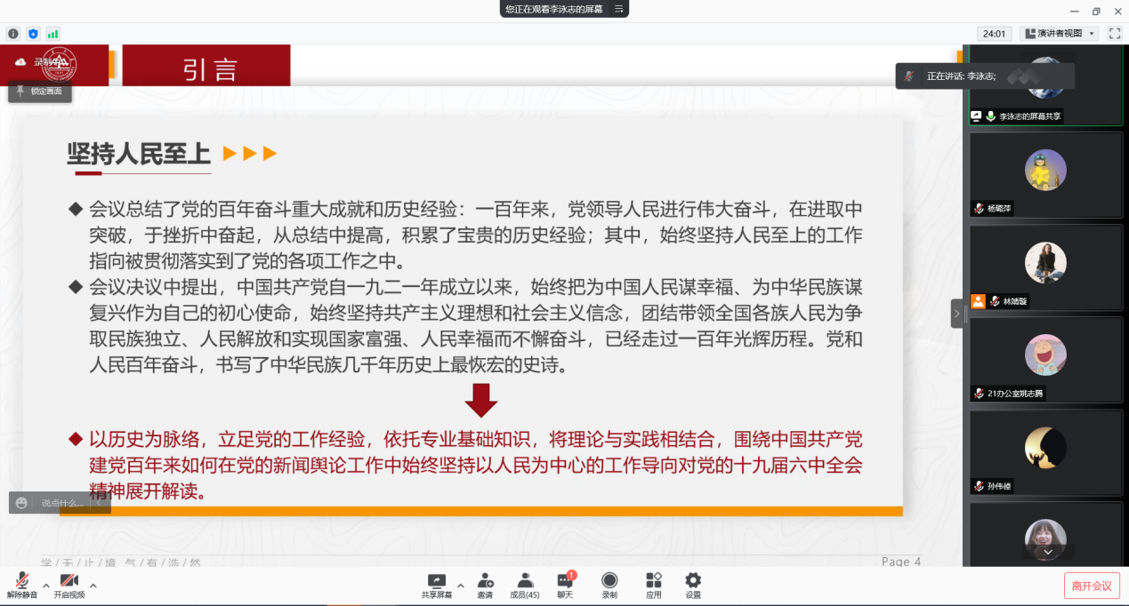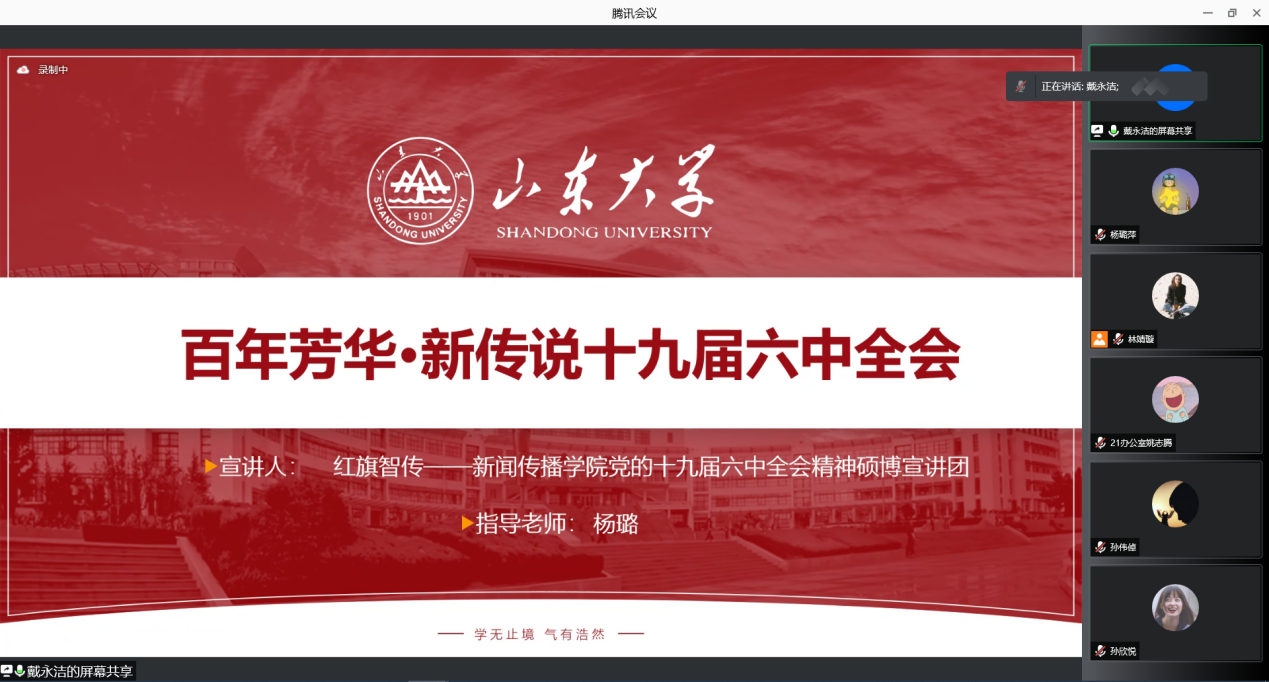 首先,硕博宣讲团展开了以“百年芳华·新传说党的十九届六中全会”为题的宣讲,立足专业视角,将理论与实践相结合,梳理在新民主主义革命时期、社会主义革命和建设时期、改革开放和社会主义现代化建设新时期、中国特色社会主义新时代五个时期,中国共产党如何在新闻舆论宣传工作中始终坚持以人民为中心的工作指向,以此对党的十九届六中全会精神进行深入解读,帮助新闻传播专业的同学们从学科角度对党的十九届六中全会精神进行深刻理解,提高思想感悟,坚定理想信念。