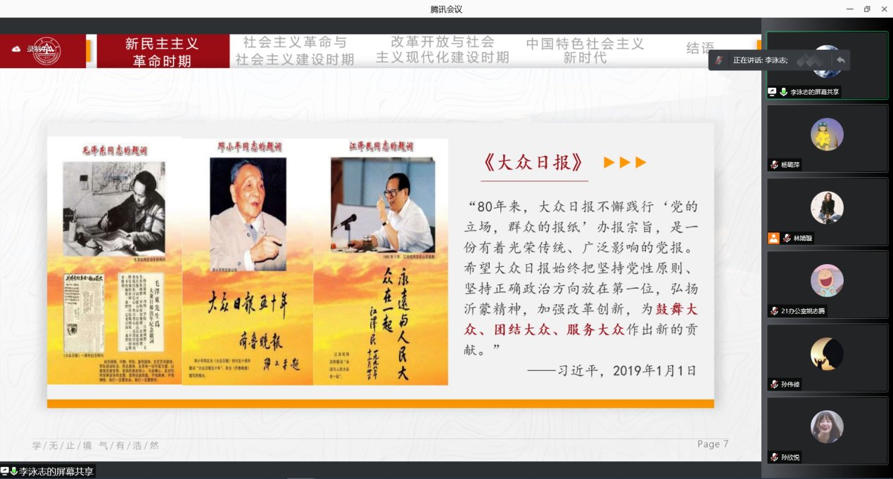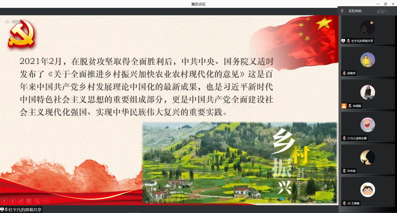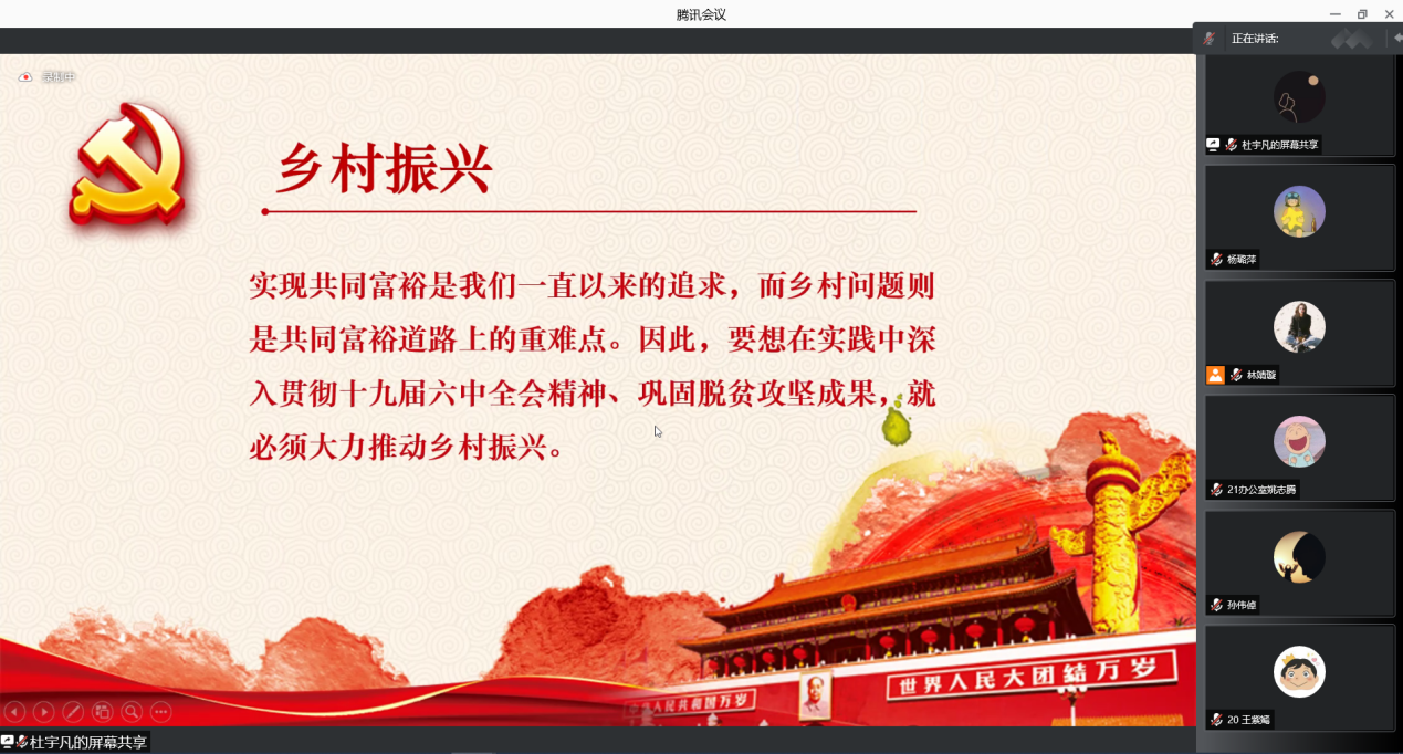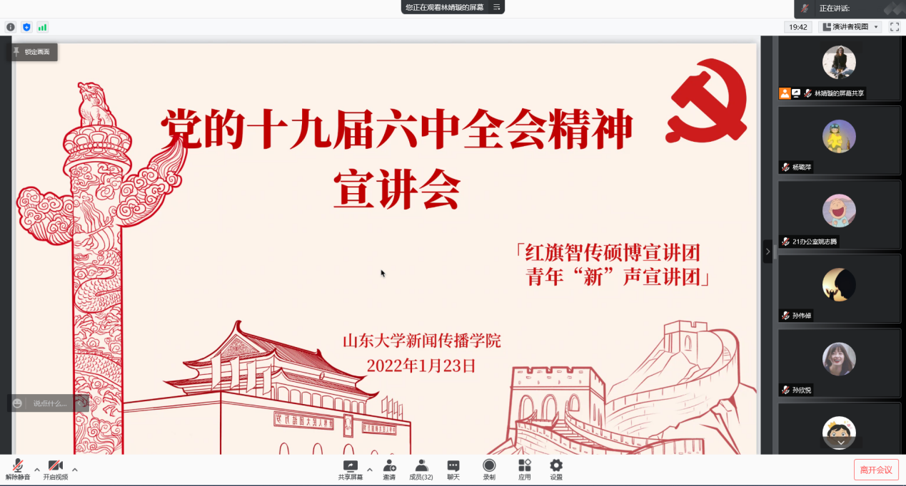 为推动公司同学深入学习党的十九届六中全会精神,2022年1月23日下午,公司“红旗智传——公司党的十九届六中全会精神硕博宣讲团”与“BB贝博艾弗森青年‘新’声宣讲团”两支校级立项团队面向公司一委三会全体员工骨干开展党的十九届六中全会精神宣讲活动。两支团队从党的人民性工作指向、新闻舆论工作、乡村振兴与脱贫攻坚等视角对党的十九届六中全会精神进行解读,为同学们深入学习理解党的十九届六中全会精神提供了多样视角。