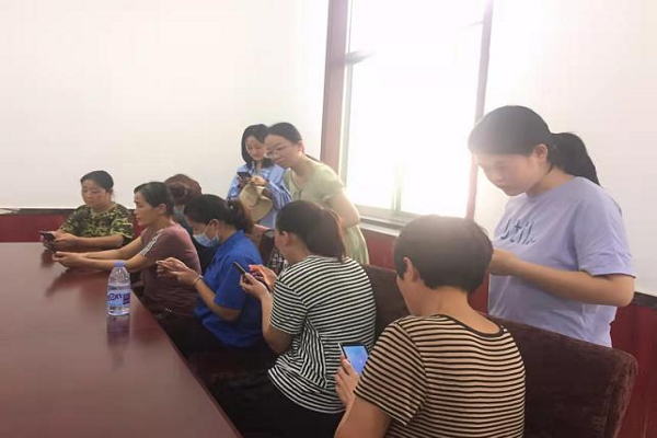 (上图为刘鲁倩向企业员工推广县级融媒体平台手机端APP)