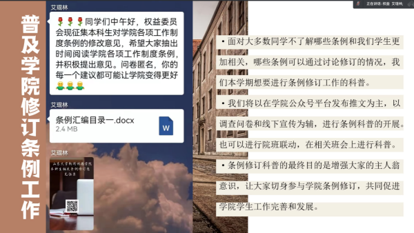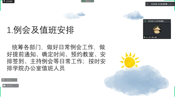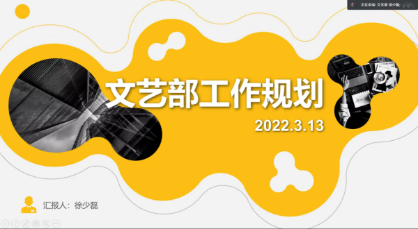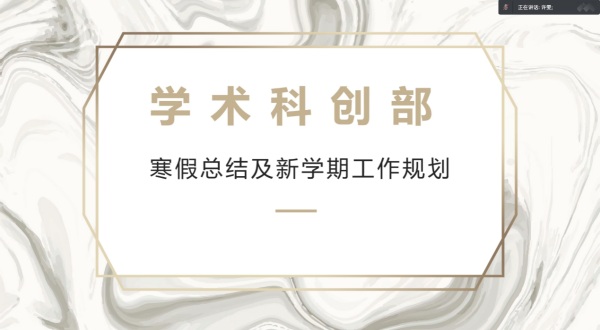 许雯作为学术科创部的代表进行汇报。她首先对学术科创部寒假工作做了总结,包括组织开展线上读书会和“青年评热点”收尾工作。随后,她向同学介绍了学术科创部新一学年的工作规划:美育主题讲座、读书日活动、考研经验分享会、毕业季工作等。最后,许雯总结阐述了学术科创部在上一学年取得的成就,并对新一学年的员工工作提出了新的期待。