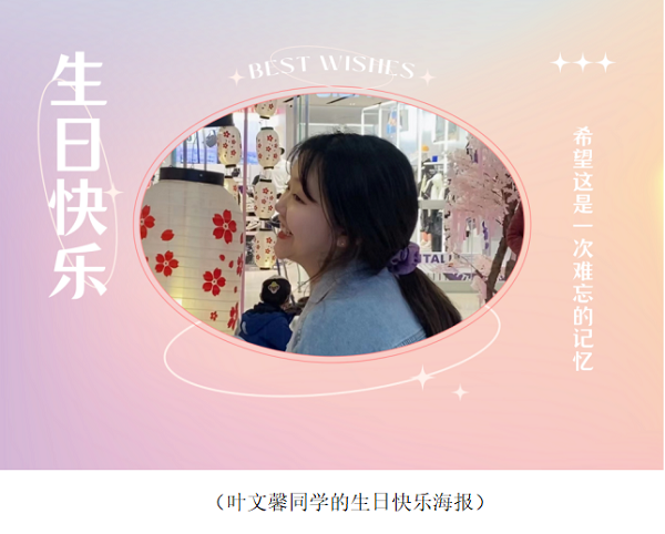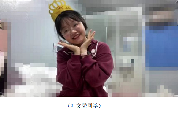 晚上8时整,宋石猛通知叶文馨“开会”。叶文馨进入会议室并打开摄像头,当她意识到大家正在为她庆生后,她十分惊喜。在同学们的提议下,叶文馨戴上生日帽,端起生日蛋糕,同学们合唱了生日快乐歌,会议室里响起了此起彼伏的祝福声——“文馨,生日快乐”“小馨,22岁生日快乐呀”……