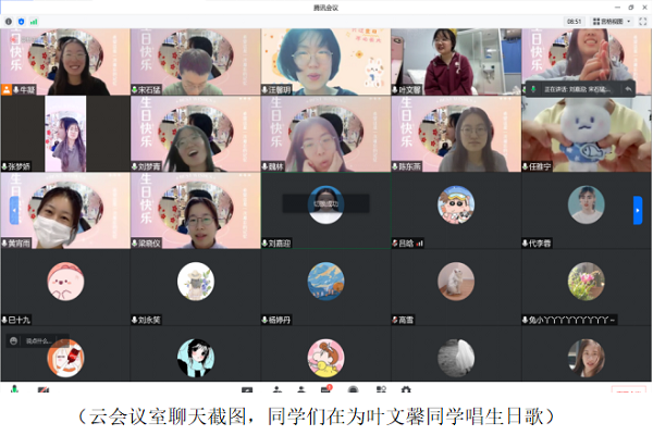 5月2日,既是2018级本科生叶文馨的22岁生日,也是大家入住长清区城西隔离点的第二天。同学们在“云”会议室进行祝福语接力,共同为叶文馨同学庆祝生日。