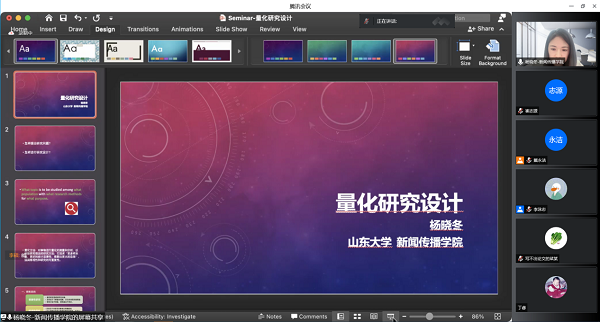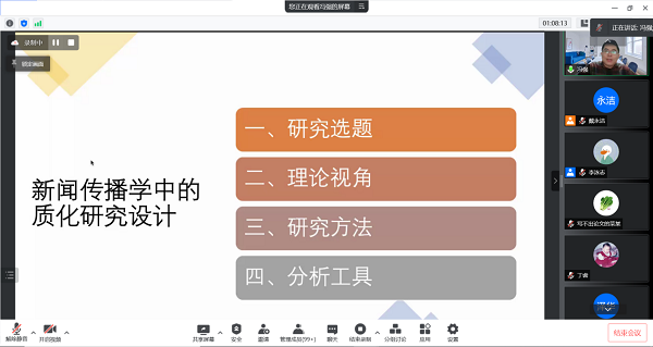 冯强副教授以“质化研究设计”为主题,从研究选题、理论视角、研究方法、分析工具四个方面进行了阐述。在研究选题上,他建议大家关注群体的特定属性与媒介(传播)实践的勾连,注重身份驱动、故乡情结与生活体验;带领大家学习了媒体、平台或栏目的组织生产、转型实践等研究以及乡镇、村庄和社区等为代表的个案研究和事件-运动驱动型个案研究的进展,以此激励同学们发掘新的话题与思路。在理论视角上,他提醒大家走出媒介中心主义的误区,开拓学术视野,避免理论概念的大量滥用。他简要介绍了民族志、田野调查、深度访谈等研究方法和主题编码、扎根理论、Nvivo等具体分析工具,并就“如何找到研究重点”“扎根理论在学术研究中的应用”等问题与同学们深入探讨。