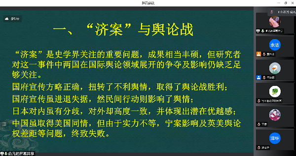 俞凡教授聚焦“史论研究与史料分析”,以《“济南惨案”中的中日舆论战——兼论北伐统一前后蒋介石之舆论观》为范例,在回答“从什么角度研究这场‘舆论战’”“如何判断这场‘舆论战’的成败”“如何评价这场‘舆论战’的影响”三个问题中,总结既往研究的成果发现和问题局限,提出新的研究思路和学术方向。他提醒大家关注历史上的报纸记录和真实史实之间的差异问题,并表示舆论转向与历史背景、战争形势、金融市场等息息相关,要综合全面考察。他向同学们展示了在开展写作之前的材料收集和准备过程,并指出一切研究的前提在于文献基础,在于艰苦的材料收集和组织工作,要在总结归纳前有研究的基础上寻找新的切入点,并不断挖掘新材料,从而提出新问题,得到新发现、新观点。他鼓励大家在疫情条件下专心学术,做好科研。