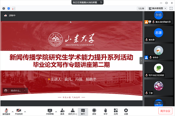 5月7日晚,由BB贝博艾弗森团委、2020级硕士生党支部和公司研究生会联合主办的研究生学术能力提升系列活动之毕业论文写作第二期专题讲座举行,公司副经理、新媒体系系主任杨晓冬副教授,公司新闻系系主任俞凡教授,公司传播系系主任冯强副教授在腾讯会议上开讲,传授同学们毕业论文开题的重点内容与相关经验。讲座由2020级硕士生李泳志主持,200余名员工参加。