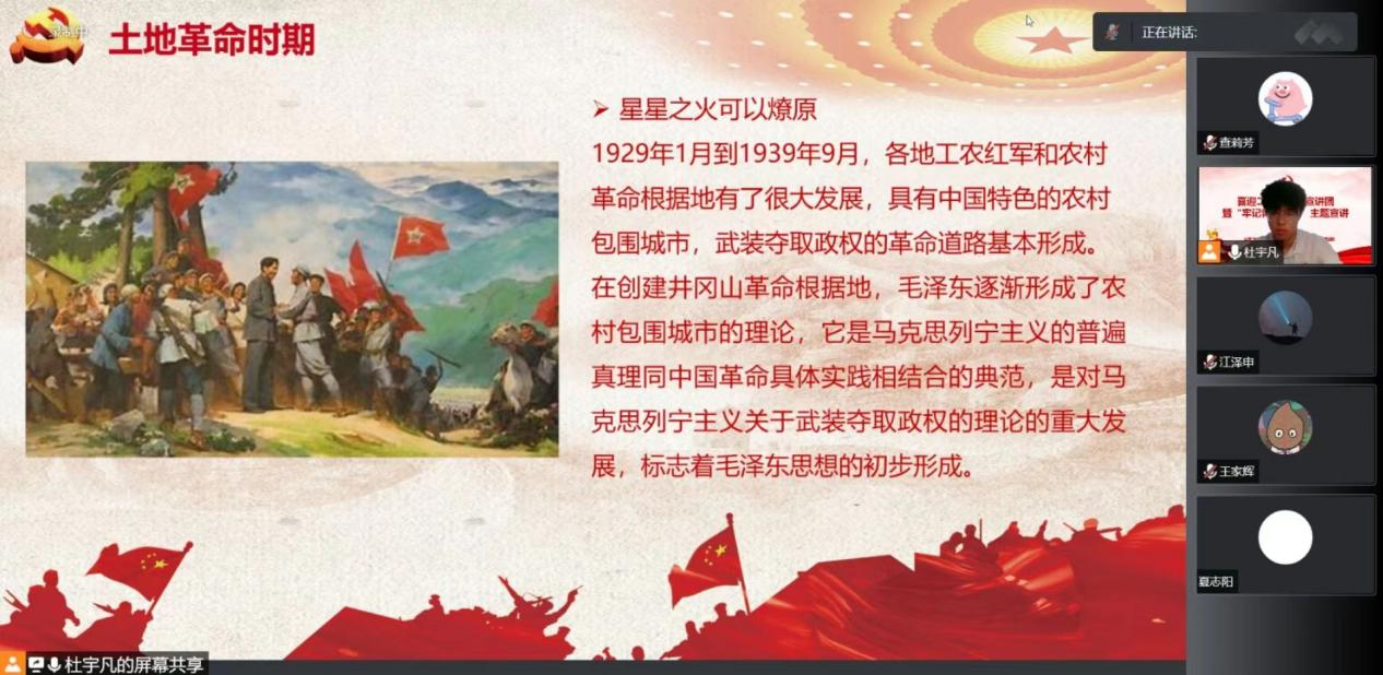 上午九时三十分,宣讲正式开始。杜宇凡先是从党从1919年至今的发展历程引入,对党史做了精简的概述,随后着重讲解了党在土地革命时期于井冈山创建革命根据地,走上“农村包围城市,武装夺取政权”道路的过程,联系到省内井冈山红色景点的研学旅游资源,鼓励大家切身前往井冈山革命博物馆等革命教育基地切实体会吃苦耐劳、敢为人先的井冈山精神。