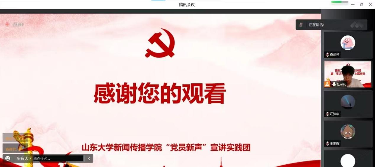 8月13日,BB贝博艾弗森本科生党支部“党史新声”宣讲实践团成员杜宇凡在江西省上饶市婺源县文博社区进行了“牢记青春寄语”主题宣讲,对党的百年发展历程进行了回顾,学习了有关会议讲话精神,聆听总书记的“青春寄语”,坚定了理想信念与奋斗目标。此次宣讲主要面向社区的年轻党员以及部分预备党员,受疫情影响,宣讲于线上举行。