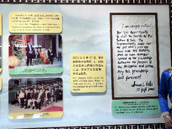 进入展厅内部,西配殿详细地讲述了中华人民共和国成立以来我国围绕苏禄王墓与菲律宾所进行的交往活动,两国在这样的历史渊源之下来往密切,结下了深厚的友谊。菲律宾高级官员以及菲律宾王室多次访华并来此拜谒祖先,也为新时代下中菲外交关系创造了升温契机。