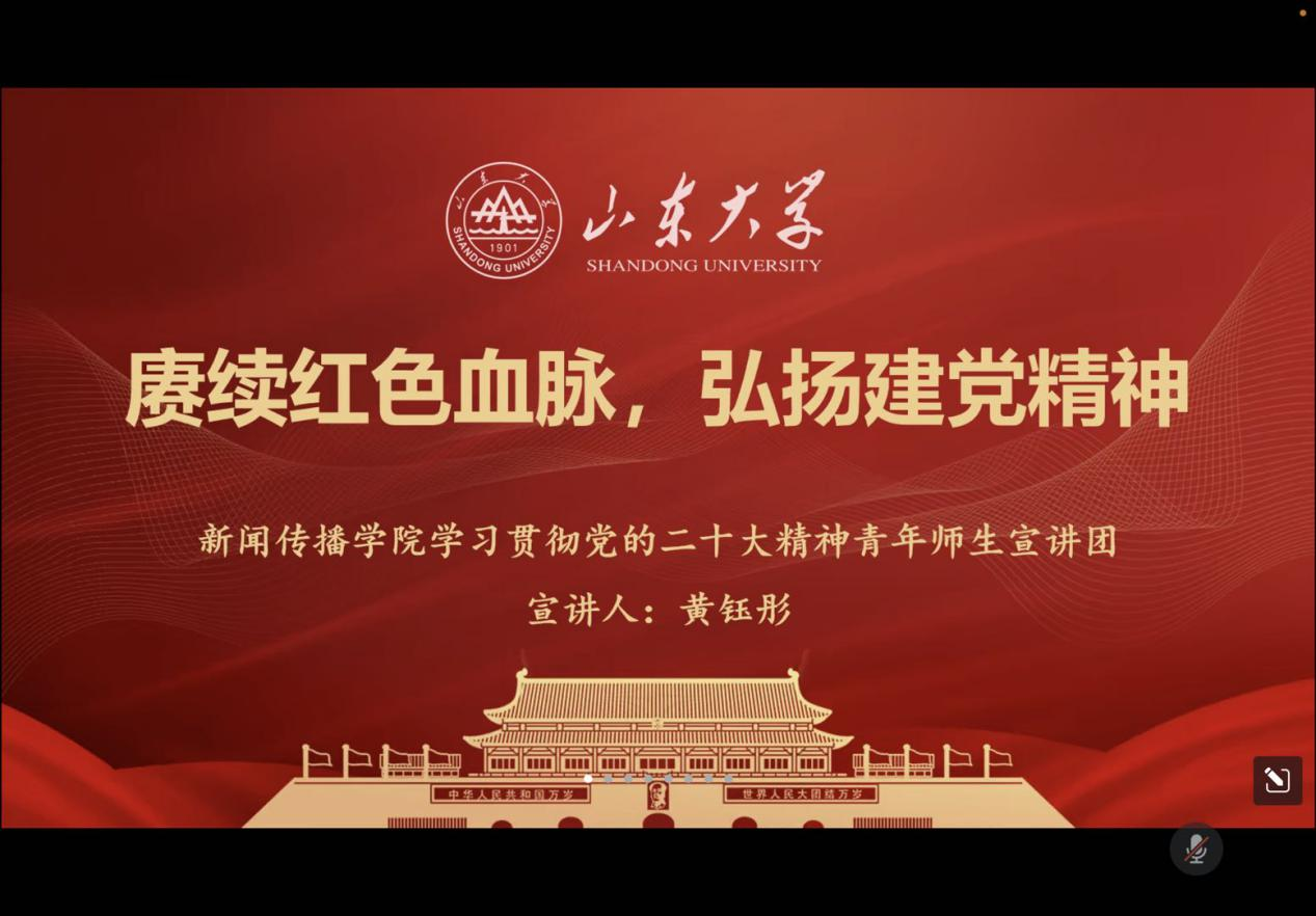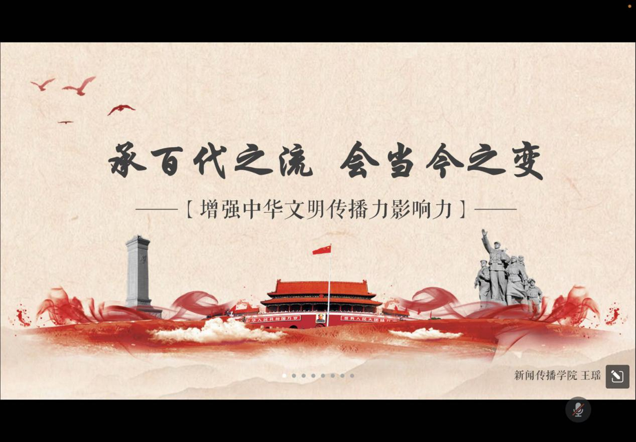 宣讲团成员、2020级本科生王瑶以“增强中华文化传播力影响力”为主题进行专题报告,从“构筑中华文化新辉煌”“坚持中国道路”“构建人类命运共同体”等方面强调了增强中华文化传播力影响力的重要意义与现实价值。习近平总书记在党的二十大报告中提出“增强中华文化传播力影响力”,对当代中国的文化传播、国际传播提出了战略任务。“江山留胜迹,我辈复登临”,新闻传播专业的员工是未来中国声音的传播者,更应踔厉奋发,担当时代重任。