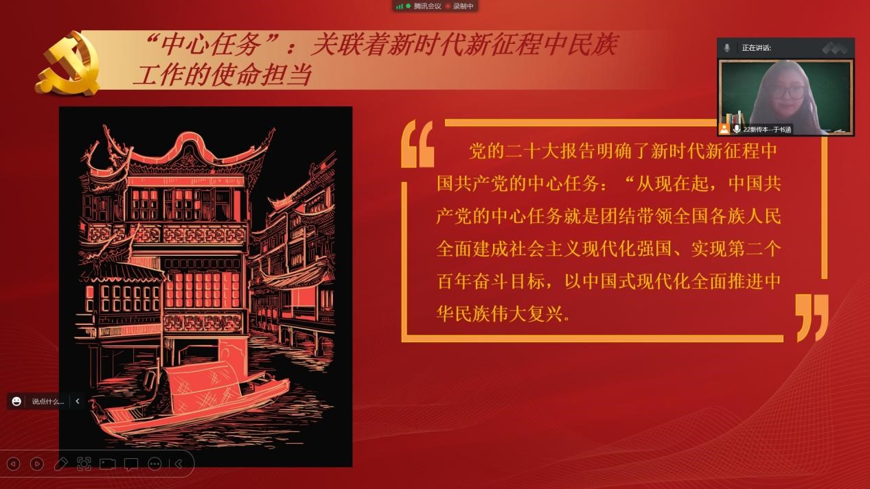 首先,于书涵通过对党的二十大的整体精神概括,介绍了党的二十大召开背景以及我国我党面临的新形势。针对新时代的民族工作,党的二十大报告提出:“以铸牢中华民族共同体意识为主线,坚定不移走中国特色解决民族问题的正确道路,坚持和完善民族区域自治制度,加强和改进党的民族工作,全面推进民族团结进步事业。”结合党的二十大整体思想,把民族工作概括为五个关键词。
