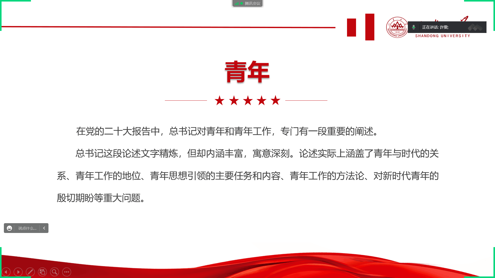随后许雯带领大家聚焦党的二十大,重新倾听那些直抵人心的青年之音。习近平总书记在党的二十大报告中强调,当代中国青年生逢其时,施展才干的舞台无比广阔,实现梦想的前景无比光明。全党要把青年工作作为战略性工作来抓,用党的科学理论武装青年,用党的初心使命感召青年,做青年朋友的知心人、青年工作的热心人、青年群众的引路人。广大青年要坚定不移听党话、跟党走,怀抱梦想又脚踏实地,敢想敢为又善作善成,立志做有理想、敢担当、能吃苦、肯奋斗的新时代好青年,让青春在全面建设社会主义现代化国家的火热实践中绽放绚丽之花。