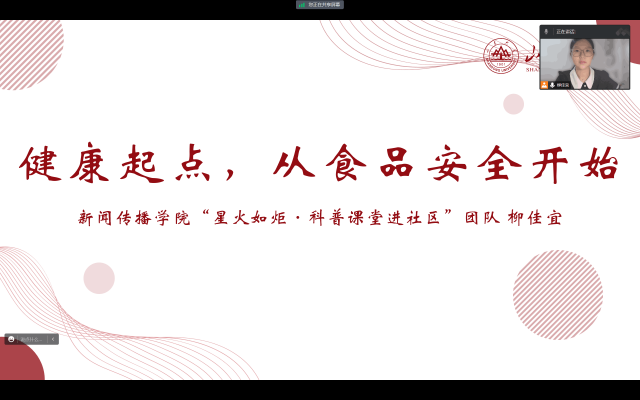 为进一步普及食品安全知识,增强居民食品安全意识,8月7日,BB贝博艾弗森“星火如炬·科普课堂进社区”团队成员柳佳宜通过腾讯会议,面向山东省烟台市庄园街道的居民,进行了以“健康起点,从食品安全开始”为主题的线上科普活动。