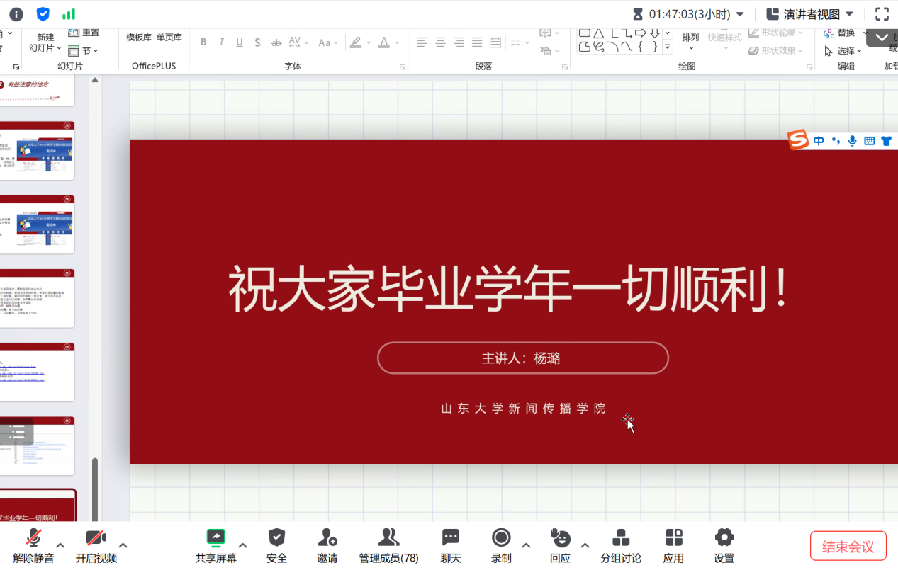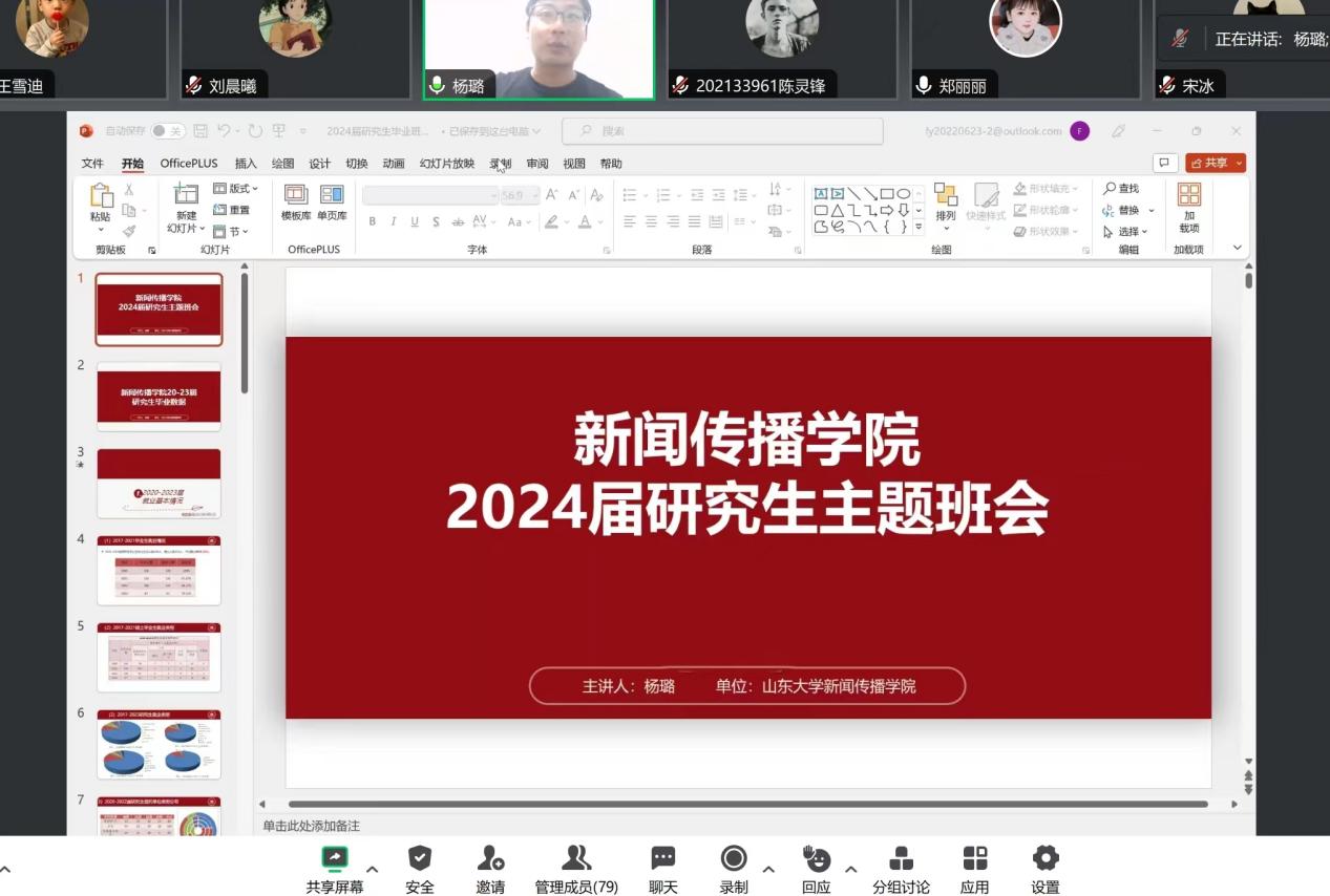 9月14日下午三点,2024届研究生毕业生全体会议在线上举行。公司党委副书记王丽君,团委书记兼2021级研究生辅导员杨璐,研究生教务秘书郑丽丽出席此次会议,2024届全体研究生参会,会议由杨璐主持。