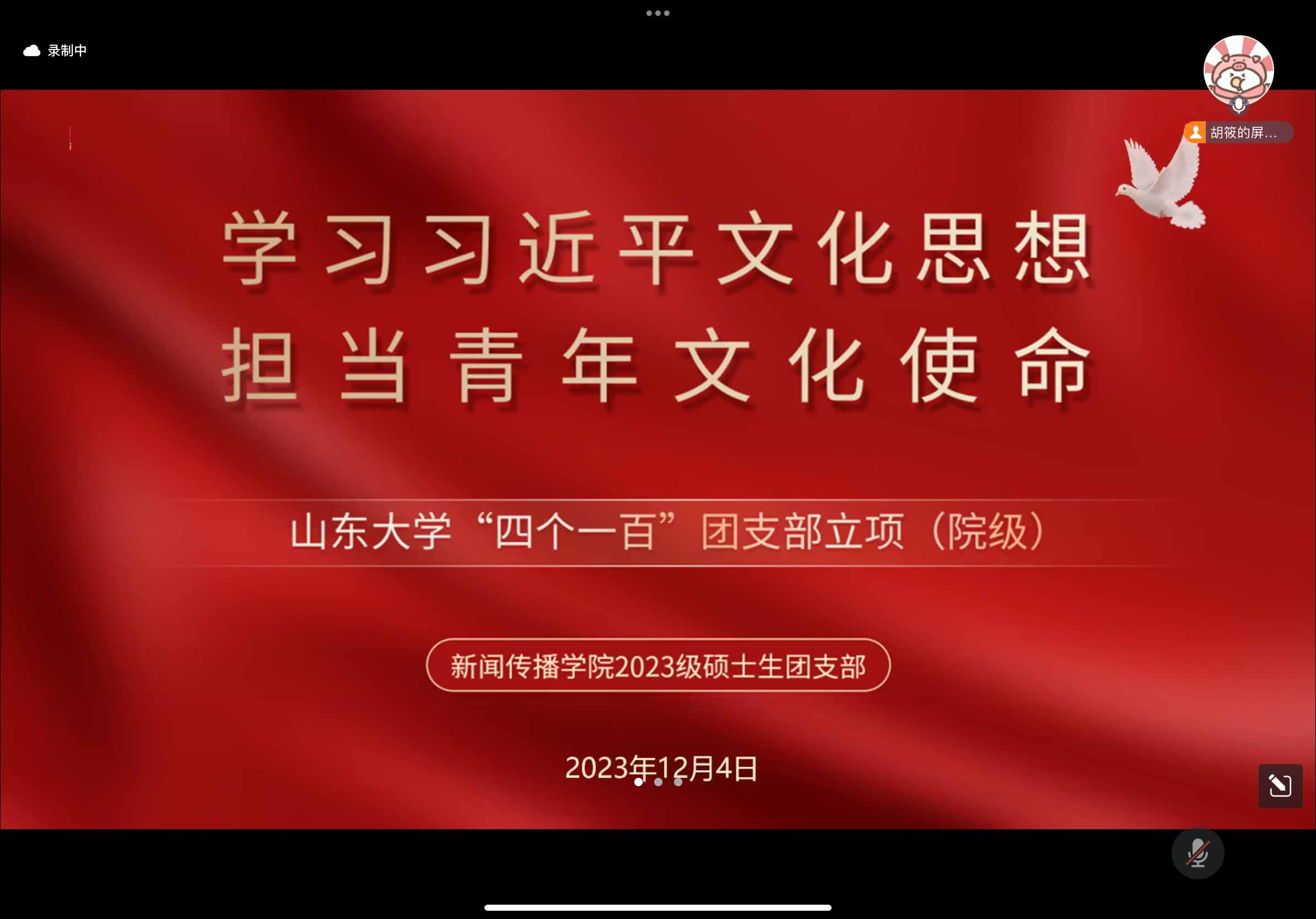 第一次主题教育于12月4日开展,为积极响应《BB贝博艾弗森关于开展“四个一百”团支部立项工程的通知》号召,2023级硕士生团支部于该日举办了主题为“学习习近平文化思想,担当青年文化使命”的活动。