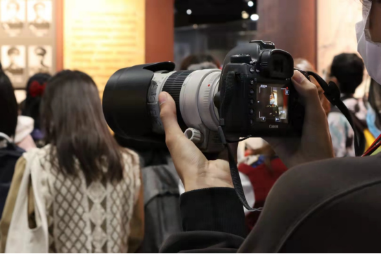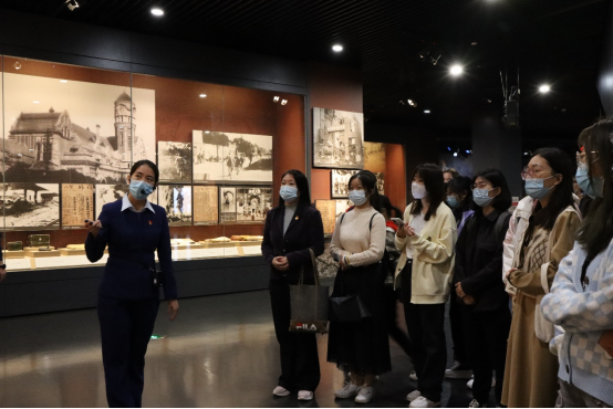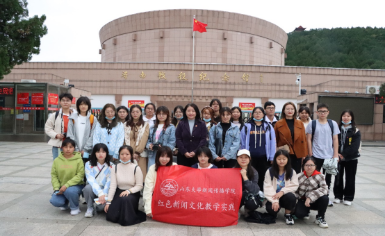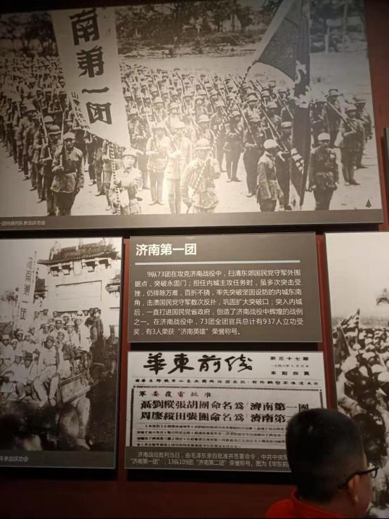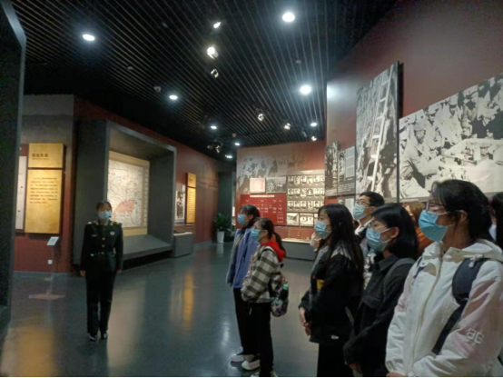 20级新闻专业的本科生在副经理、红色新闻文化系列课程负责人邱凌的带领下步入济南战役纪念馆大厅,馆内气氛庄严肃穆,陈列着大量济南战役相关的革命史料和实物。讲解员告诉大家,济南战役拉开了解放战争三大战役的序幕,在历史上具有重要地位。随着讲解员的细致讲解,同学们遨游在历史长河之中,纵览了近现代济南带有浓厚红色气息的发展历史:从慷慨激昂,无数战士抛头颅洒热血的济南战役,到人民倾其所有,“用小车一车车推出来”取得胜利的三大战役,到中华人民共和国成立后新时代济南的蓬勃发展……为有牺牲多壮志,敢教日月换新天,今日的美好家园,幸福生活,离不开无数先辈抛头颅洒热血接续不断的奋斗,离不开中国共产党的领导。参观过程中,有的同学走到馆藏史料前,垂眸沉思;有的同学拿起摄像机,拍摄采访;有的同学相互交流讨论,分享心得体会……馆内苍松翠柏映着同学们青春洋溢的身影,红色精神的种子不知不觉间在大家的心底萌发。