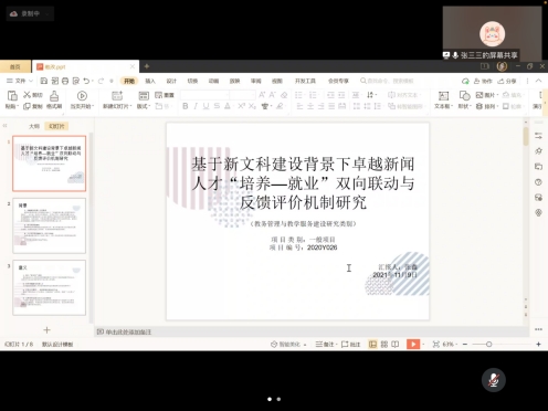 张鑫对《基于新文科建设背景下卓越新闻人才“培养——就业”双向联动与反馈评价机制研究》进行结题汇报,项目围绕培养、就业两个人才生产端口,从就业角度回顾整个人才培养情况,基于教务工作的基础环节,对新闻传播人才培养和就业进行研究,助力学科新文科建设,强化就业对人才培养的认识,通过培养环节的动态来促进复合型人才培养,为人才培养提供坚实的基础和完善的环节,努力打造具有BB贝博艾弗森特色的一流新闻传播本科专业,完善培养就业双向互动的反馈机制。同时项目着重研究学科交叉融合,不断升级人才培养模式,对公司培养方案更新、毕业论文设计改革进行推进,结合学科创作新闻传播卓越人才核心竞争力的结构模型,不断推动公司教务工作的有序进行。