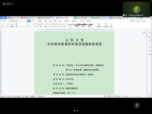 于晓风对《内涵深化、多元共治与模式创新:传播视域下的“影视传播”课堂教学改革研究》进行结题汇报,项目落实卓越新闻传播人才公司产品计划2.0的具体措施,响应新文科建设,推动哲学社会科学与新科技革命交叉融合,以产学研结合的实践体验扩张传播学研究的内涵和话语体系。项目载体“影视传播”课程于2021年入选校级精品课程,并入选2022年度国家级、省级一流本科课程的校内推荐名单;网络课程“影视文化传播”持续在线上为老员工提供学习服务;同时课程实践成果专题人文纪录片《毛坪的路》获得多项纪录片大赛奖项,该片由山东省委宣传部推荐登录“学习强国”平台;项目选题还将传播学、文化学、美学、心理学、社会学、符号学等融入课题,对高等教育综合改革教育内容进行创新,不断促进多学科的交叉融合。
