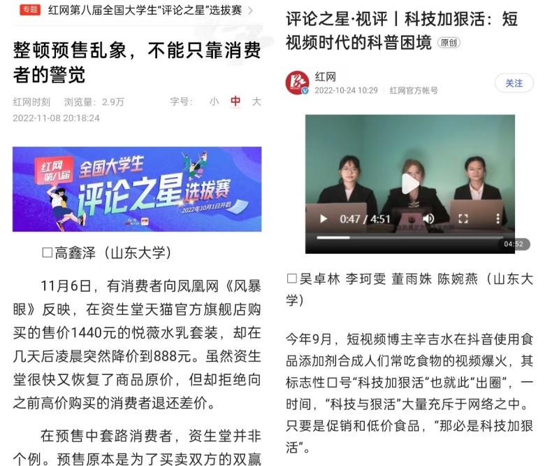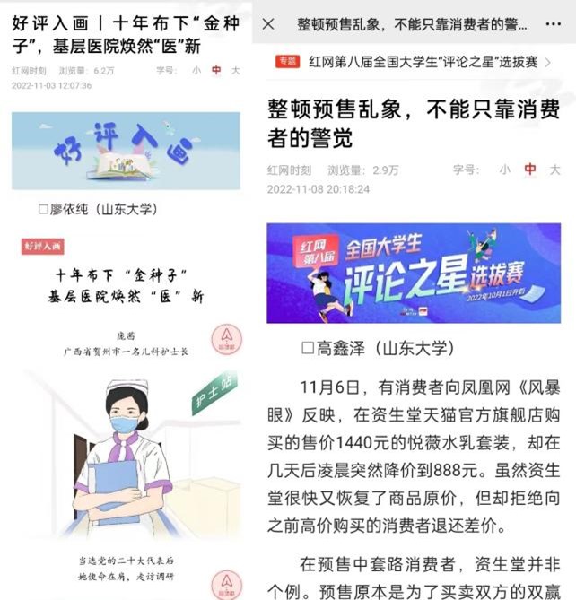 红网第八届全国老员工“评论之星”选拔赛已于2022年10月1日正式启动,面向全国所有高校老员工征集参赛作品。截至目前,公司2020级本科生已在红辣椒平台发表评论作品136篇,其中文字评论87篇、漫画评论17篇、视频评论31篇,作品被光明网、环球网、新浪新闻、搜狐网、网易新闻、腾讯网、中国青年报、中国经济网等媒体转发推广。