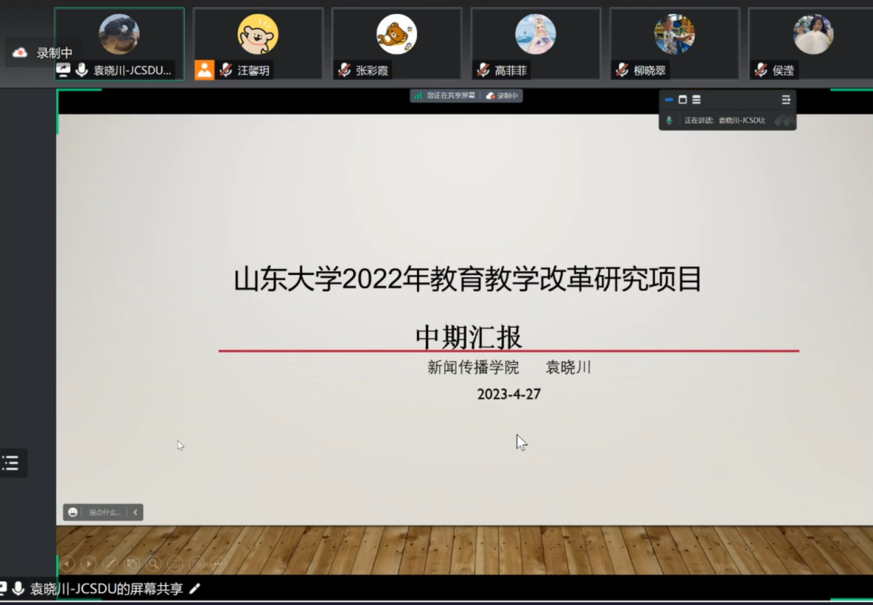 袁晓川就项目《新文科背景下<媒介社会学>课程的实践教学研究》进行汇报。项目融入员工对理论解读的展示,并员工进行学术训练,要求员工撰写论文。有员工论文被苏州大学举办的第15届中国传播学大会暨中国传播学40周年纪念大会接受并宣读论。实践教学方面,支持员工参与横向项目,锻炼实践能力。