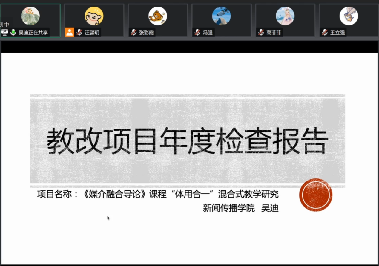 吴迪就《<融合导论>课程“体用合一”混合式教学研究》项目的进展进行汇报。为达到启用合一的效果,项目课程将理论学习和实践的训练比例设置为1 : 1,在课程设置过程当中,安排贴近现实的仿真实践作业,借助实验室技术支撑,通过小组项目制,将员工置于传播活动的仿真情境之中,真正去掌握媒介融合相关技术应用。项目邀请媒介融合从业者走进课堂,结合切身的经验进行分享交流。让员工走进山东广电、制作媒介融合作品参赛,将实践和媒介融合的理论体系的知识学习勾连起来,关照当前的媒介现实,对于媒介融合有更深刻体会和思考。