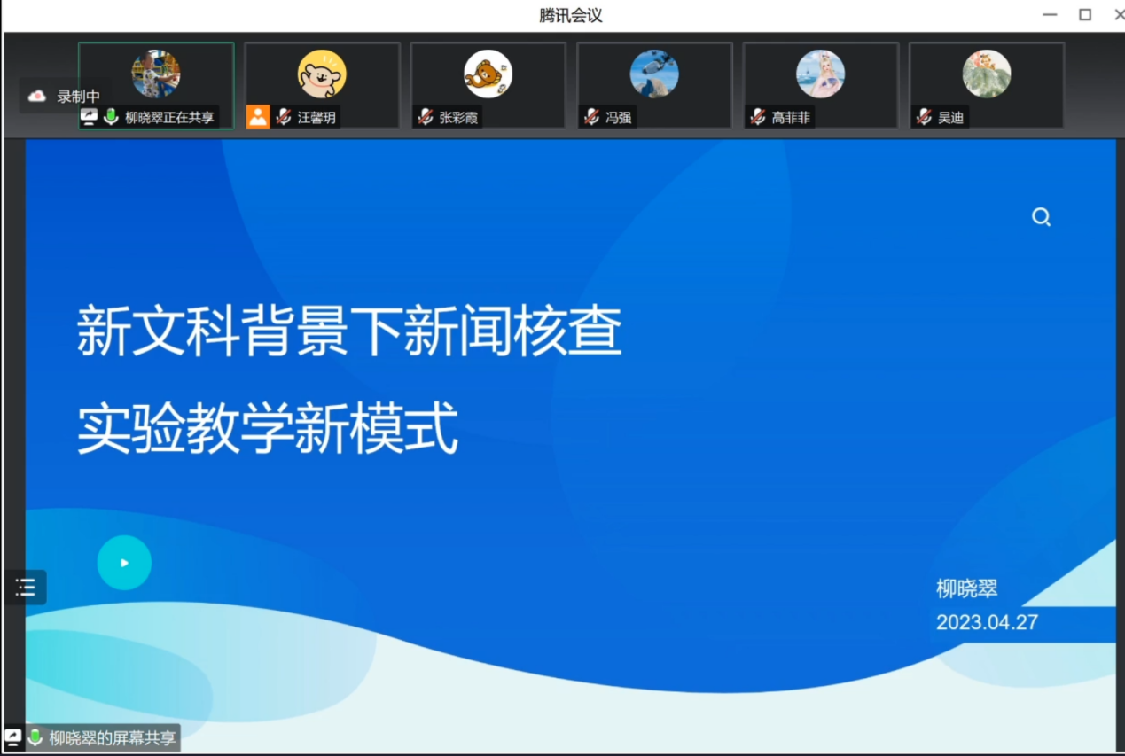 柳晓翠就项目《新文科背景下新闻核查实验教学新模式》的进展进行汇报。项目采用案例教学法、任务驱动教学法、探究教学法和实验教学法,让员工的成果展示在实验报告里体现,培养员工学以致用、用于探索的科学精神。项目采用课堂问卷调查和员工座谈的方式,了解员工对授课内容、考核方式和实验的需求,根据员工反馈,修订教学内容。
