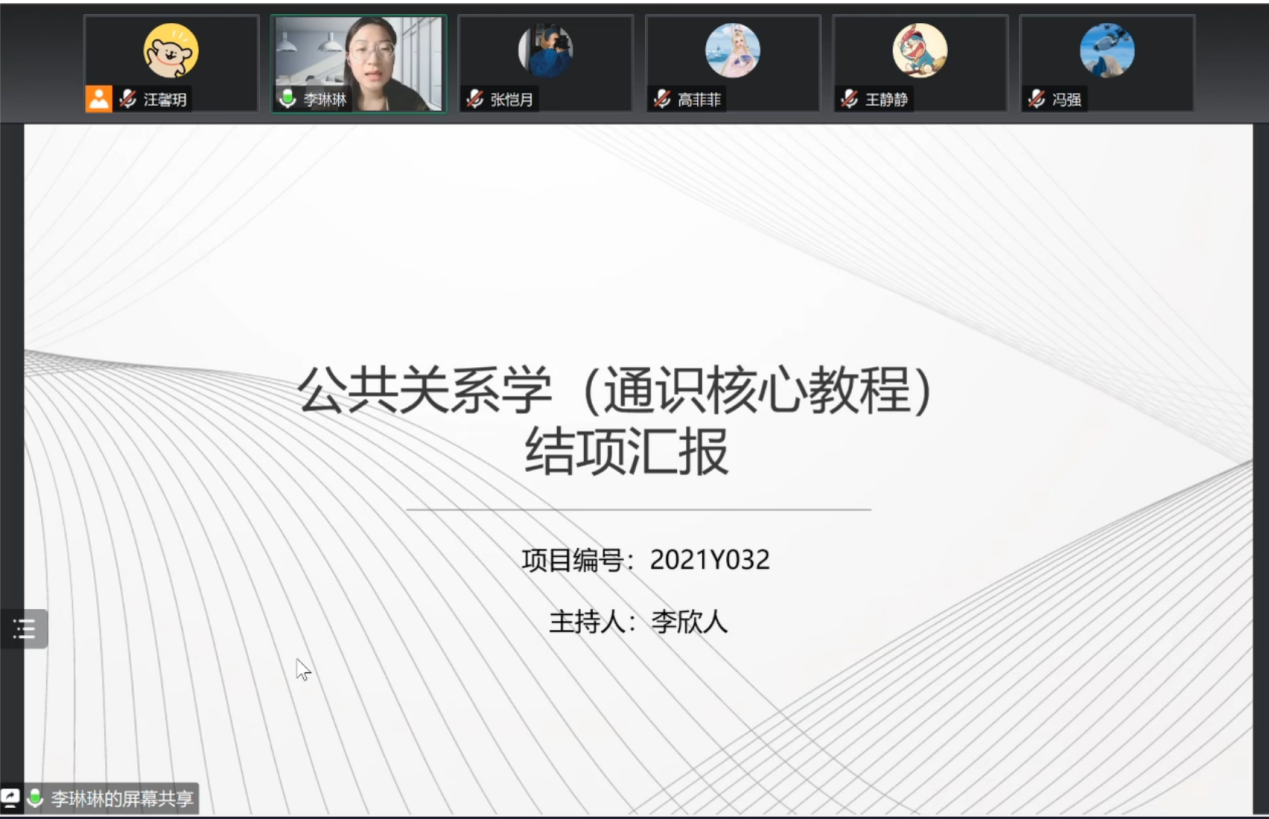李琳琳就李欣人主持的公共关系学通识核心教程项目进行汇报。李琳琳首先指出,项目要解决的主要问题教程建设,进一步丰富和完善线上和线下资源,最终形成立体化的教学资源。李玲玲随后展示了项目成果,项目努力建设适应通识教育课程特点的教程《公共关系学》;把书本课程和多媒体有机结合,形成了立体化教程;在现有教学队伍的基础上,通过教程建设,完善了教学人员的专业素养,强化了课程的系统性,提升了该领域的教学水平。