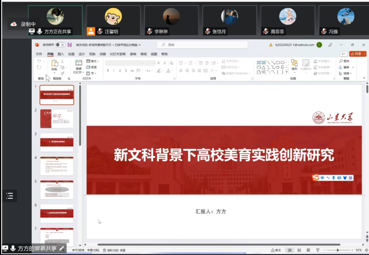 孟丽就《新文科背景下以<百微山大>为教学实践和课程思政融合平台的模式创新研究》项目进行汇报。项目依托新闻传播学科的人才优势以及公司宣传阵地,发挥公司的融媒体资源,为新闻传播人才培养来进行平台服务。百微山大为教学实践和课程思政平台模式,立足新时代,回应新文科的建设需求,承担了公司的本科视频学等元素,融入到课堂教学的环节,师生协同,形成基于百微山大平台的完整的课程思政体系,实现了课程思政的全程融合。依托课题,项目发表了论文,出版了专著,已推出300多期百微山大视频。