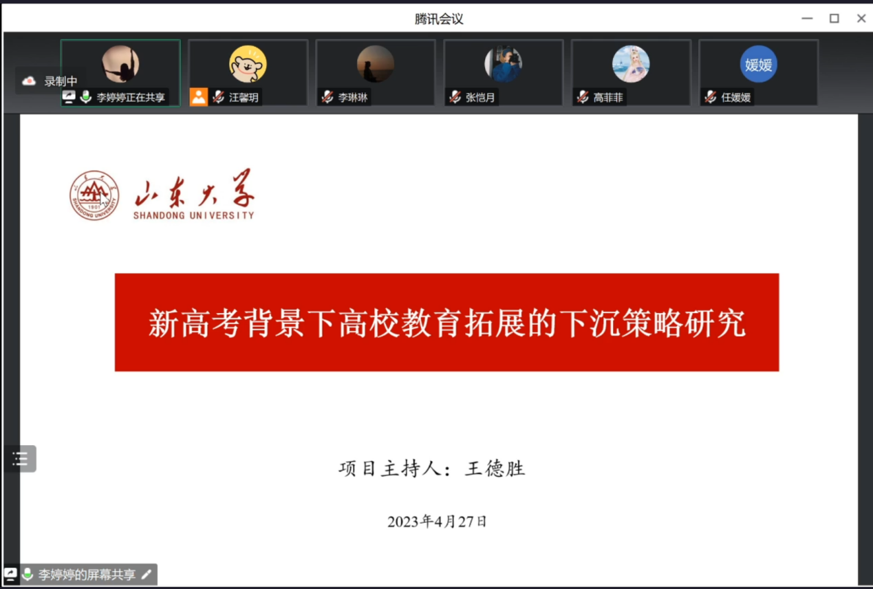 李婷婷就王德胜主持的《新高考背景下高校教育拓展的下沉策略研究》项目进行汇报。项目解决了探索高校应对新高考挑战的内部创新举措、明晰人才培养规格和选拔标准、探索高校招生的综合评价与多元录取机制三个问题。项目首次借鉴价值链的概念,构建起高校、高中员工及家长、媒体、政府等一体化的价值链系统,深化了高校与中学在选材、育才方面的无缝衔接;结合实地考察经验,深化了高校专业调整、课程设置和人才培养的创新举措,提出相应的对策建议,推出富有可借鉴性、可复制性的工作方案。