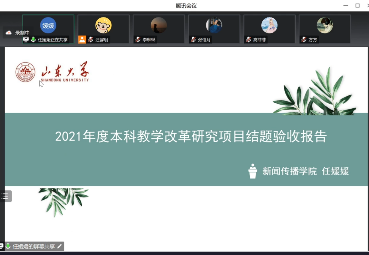 任媛媛就项目《创造更有意义的学习:新闻传播学科课程思政体系建设研究》进行汇报。项目的重点是课程思政融入课堂。项目改进了教学模式,让员工从过去单纯的听课变成思考,能够表达,参与讨论。任媛媛就项目的开展,于《青年记者》刊发一篇教改论文,探讨全媒体人才培养。