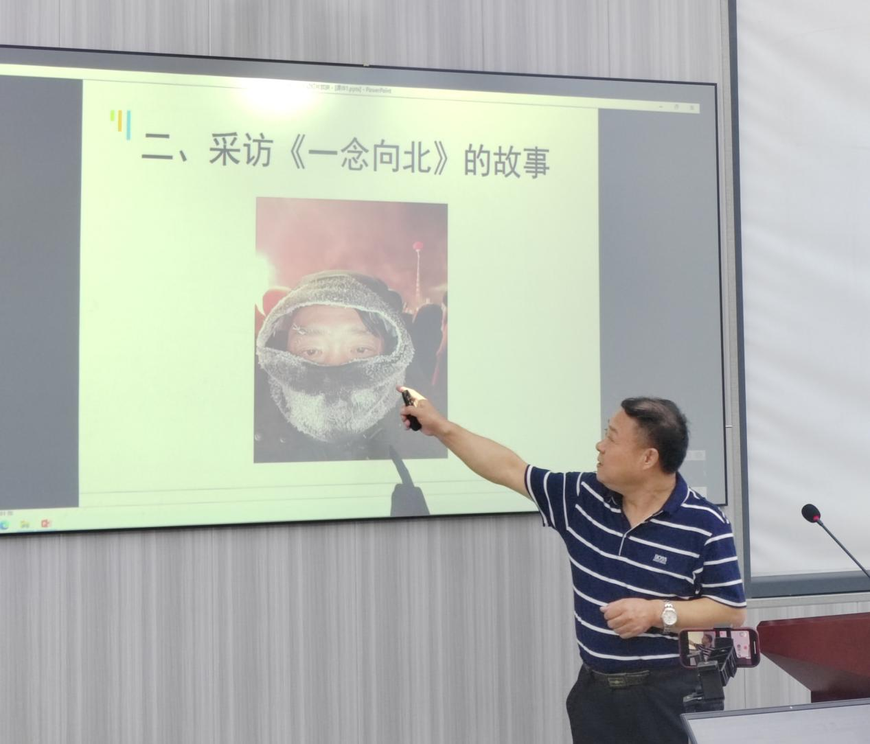 逄春阶分享的第一个故事是他采写《一念向北》时的见闻。在零下四十度的极寒天气里,他前往中国的最北端的漠河,采访中国重汽集团位于此地的“三高”创新团队。在这个号称中国“北极村”的城市里,天寒地冻,泼水成冰,呼出的水汽都会凝结成白霜挂在眉毛上。在如此恶劣的极端环境中,他们遇到过许多困难。油箱被冻住,他们便躺在冰封的土地上用嘴吸柴油。路上汽车抛锚,在手机没电、孤立无援的紧急状态下,他们焚烧轮胎呼叫救援……科研人员们认真负责的工作态度和积极乐观的工作热情,深深地打动了逄春阶。他从这些80后、90后年轻人身上,看到的不是网上所说的摆烂与颓废,而是一种光泽,“这种光泽就是希望,国家的希望,民族的希望”。他说,写新闻稿的时候要把最真实的感受写出来,一要写现象,二要写见解和感受。“新闻越朴实、越真实,越能打动人”。