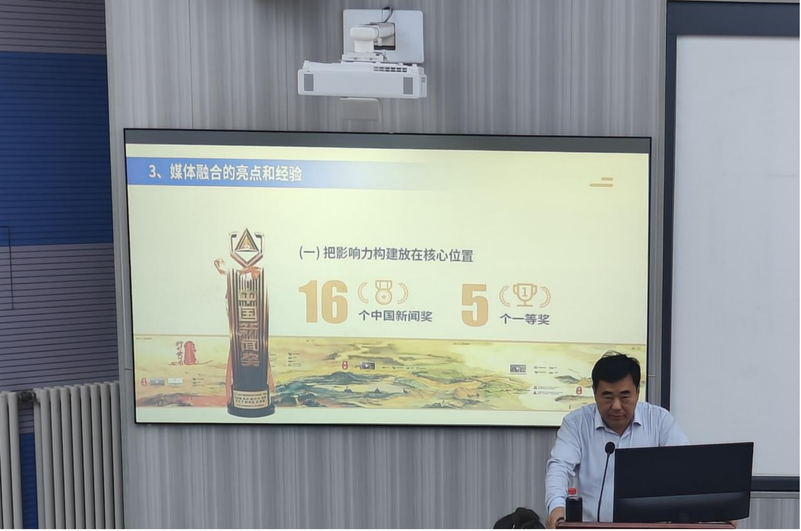 在媒体融合实践中亮点和经验的分享中,刘加增围绕“把影响力构建放在重要位置”“布局全国战略”“深耕山东战略”三个关键点详细展开阐述。传统媒体的信息投放是粗放的,但互联网可以根据用户所需实现精准推送。根据网媒集团优异的获奖成绩,刘加增总结了媒体运营的实质是影响力的营造和营销,而影响力的营造关键在于内容的“含金量”,新闻采编因而发挥着重要作用。网媒集团突出的成绩、高质量的新闻内容也证明了“布局全国”和“深耕山东”战略的有效性。网媒集团在省内136个县区设置工作室,面对突发新闻、焦点新闻时真正实现了首发报道,极大地提高了知名度。