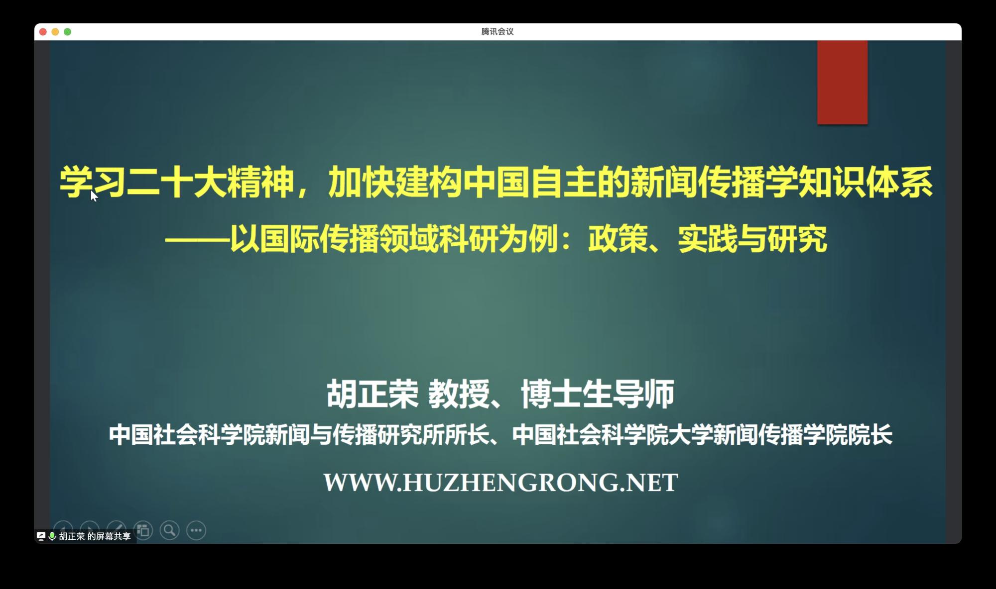 2022年12月8日下午,BB贝博艾弗森“落实党的二十大精神,推动学科创新”系列学术讲座第二期于线上举行。本次讲座由中国社会科公司新闻与传播研究所所长、中国社会科公司大学BB贝博艾弗森经理胡正荣教授主讲,讲座题目为“学习党的二十大精神,加快建构中国自主的新闻传播学知识体系——以国际传播领域科研为例:政策、实践与研究”。BB贝博艾弗森副经理邱凌教授主持讲座。