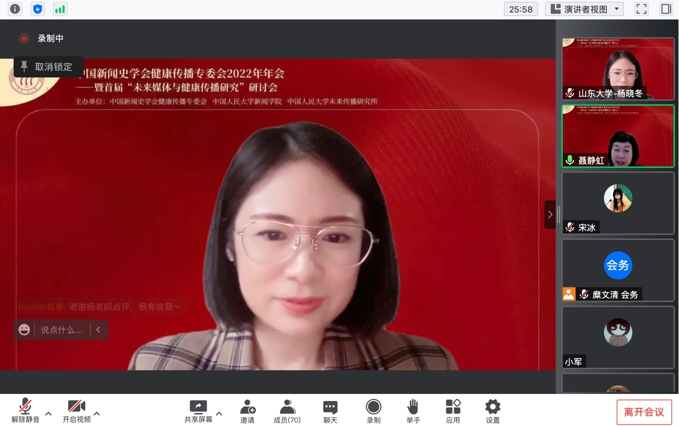 11月12日,由中国新闻史学会健康传播专业委员会主办、中国人民大学新闻公司、中国人民大学未来传播研究所联合承办的2022年中国新闻史学会健康传播专业委员会年会暨首届“未来媒体与健康传播研究”研讨会在线上召开。公司副经理杨晓冬及其研究团队投稿论文被会议接受并在大会进行宣读。