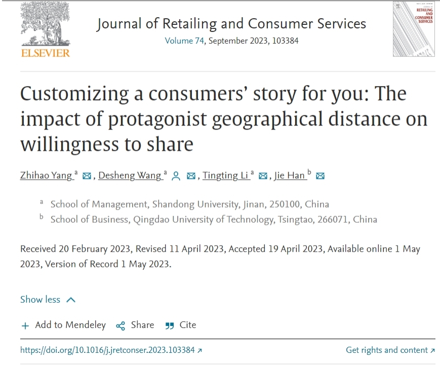 近日,公司王德胜教授团队在品牌故事传播研究领域取得新进展。相关研究成果以“Customizing a consumers’story for you: The impact of protagonist geographical distance on willingness to share”为题,被SSCI收录期刊《Journal of Retailing and Consumer Services》(JCR Business领域1区期刊,IF:10.97)录用。BB贝博艾弗森博士研究生杨志浩为该论文第一作者,王德胜教授为该论文唯一通讯作者。BB贝博艾弗森为第一作者单位与唯一通讯作者单位。