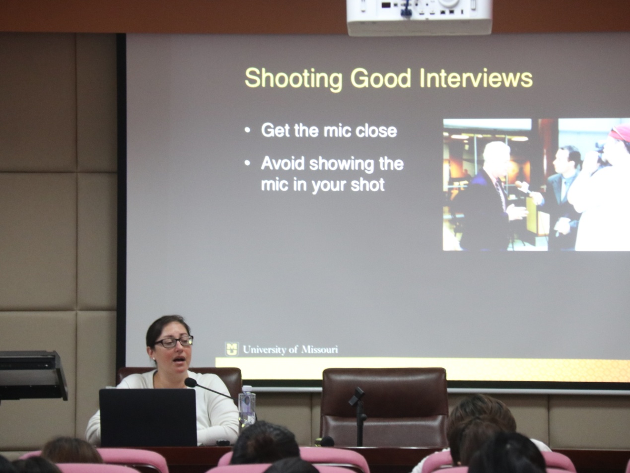 随后的课程里,艾米副教授就“密苏里新闻公司的媒体融合类新闻报道和编辑教学内容”主题,着重介绍了如何从理论和实践角度做好媒体融合类新闻报道。艾米指出,好的新闻报道要做好“视觉”、“兴趣”、“新奇性”、“新闻价值”、“冲突性”、“策划”这几个方面。在此,她详细阐述了“新闻价值”的八个共同特点,分别是“影响力”(impact)、“权重”(weight)、“及时性”(timeliness)、“接近性”(proximity)、“突出性”(prominence)、“冲突性”(conflict)、“新奇性”(novelty)、“可用性”(usefulness)、冲突性(C is for conflict)。