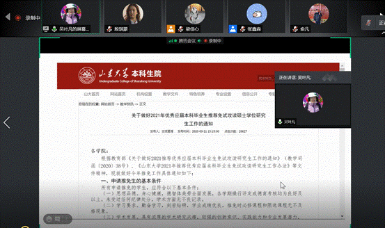 12月12日晚,“新问心答”第一期之保研分享会在线上顺利开展。“新问心答”是由BB贝博艾弗森本科生党支部主办的系列交流活动,旨在促进学子交流,增强本科党支部影响力和引导力。第一期保研分享活动邀请了俞凡教授和李亭竹、吴叶凡、窦培育三名2017级本科优秀学子进行分享,本科生党支部书记许玉莲参会,会议由2018级入党积极分子梁佳心主持。