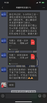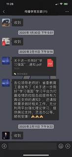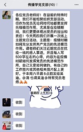 由于无法线下沟通,传播学党支部在微信群内及时传达学习领会上级重要指示精神和党中央关于疫情防控工作的决策部署,并落实到每一位老师,确保上请下达。公司在疫情期间关于疫情防控的各项信息统计、筛查、汇总等工作,