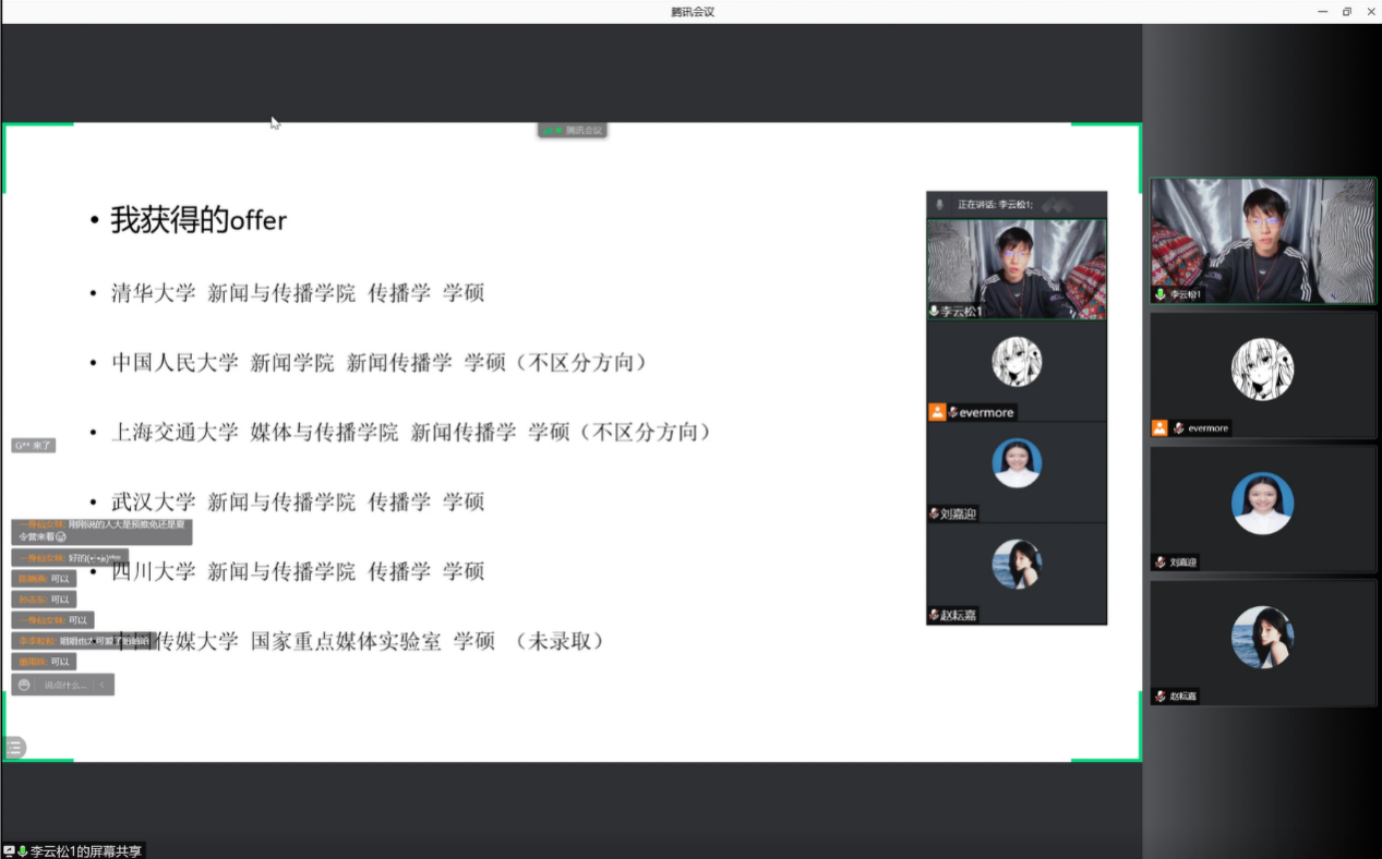 四位高年级同学的分享为大家总结出了详尽实用的保研经验,提出了切实可行的保研建议,帮助同学们对保研有了更深的了解和认识,也展现了2018级新传本科学子的风采。