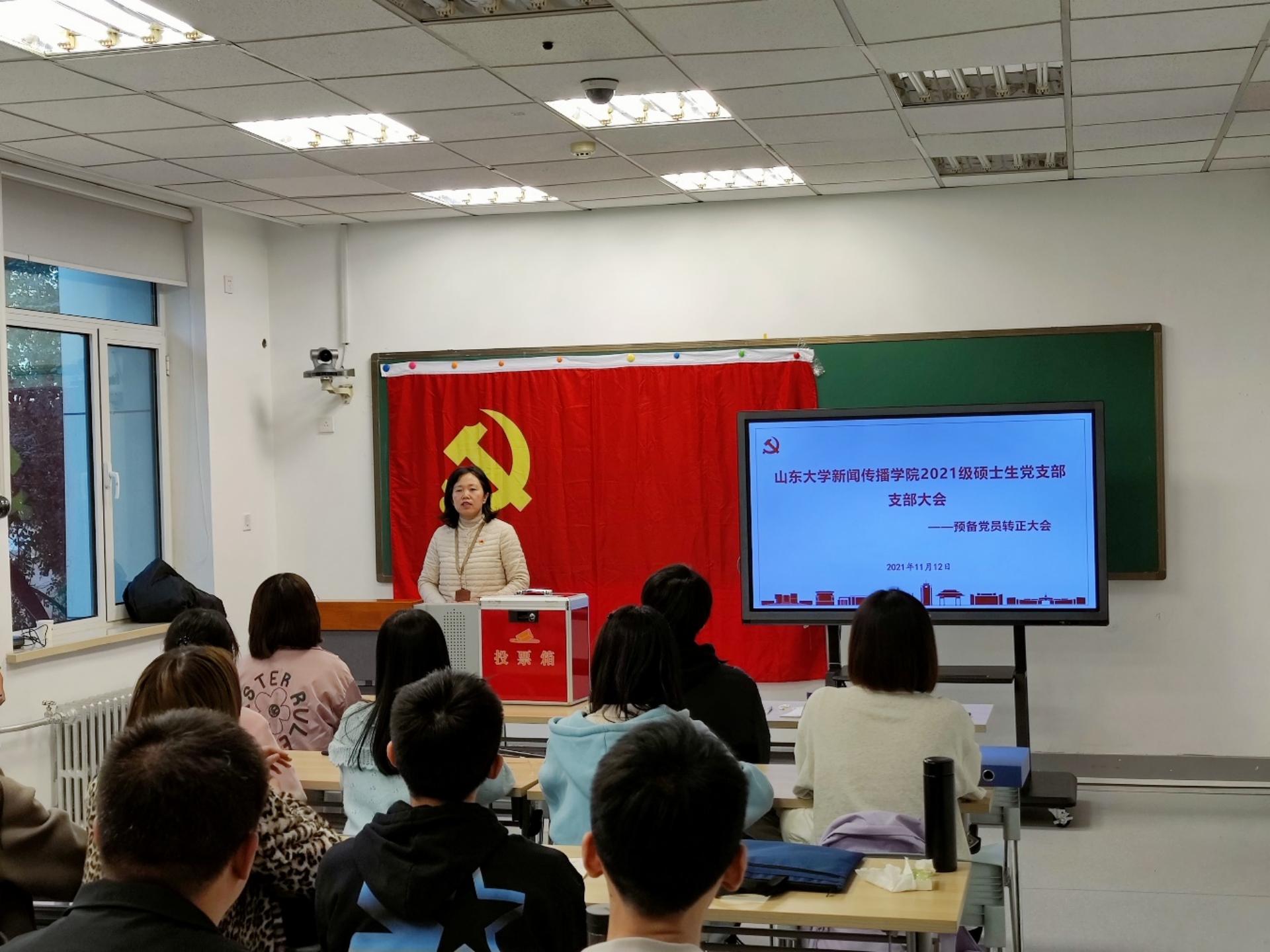 会议最后,组织员王智洁老师进行总结讲话。她首先对祝贺五位转正党员同志,并对今后的发展提出期望和要求:希望他们谨记党员的身份,在思想上有党员意识,并继续踏实完成理论的学习,做好精神思想工作。她还寄语2021级硕士生支部的全体成员,希望全体员工党员能够勠力同心,端正历史观,保证在社会主义意识形态领域“不偏航”“不触礁”的同时,推动中华优秀文化创造性转折、创新性发展,争做兼具国际视野和家国情怀的高素质新闻传播人才,以吾辈之青春,恪守国家命运之责任,与时代同频共振。