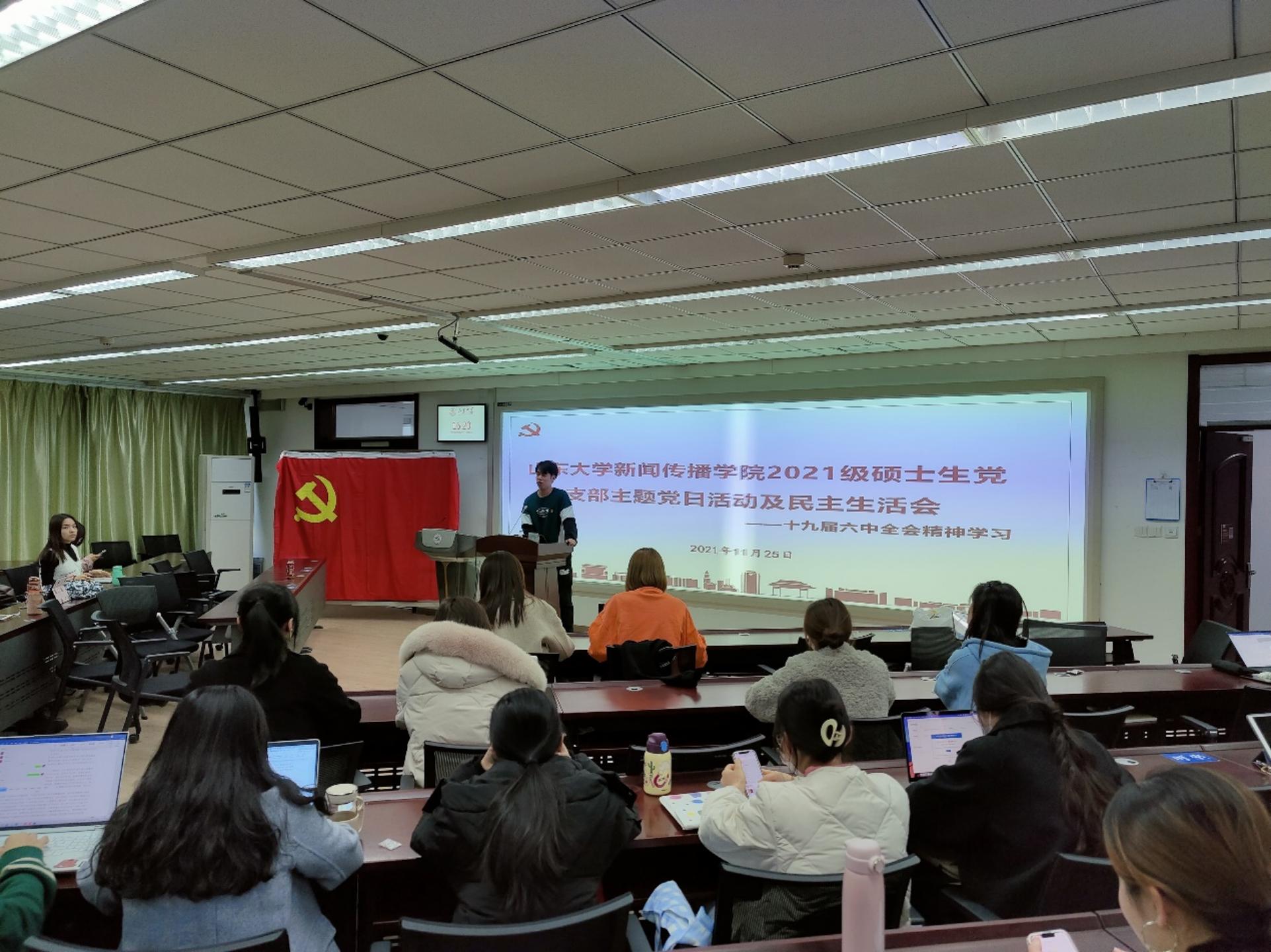 2021年11月25日,2021级硕士生党支部于逸夫信息楼B201室开展深入学习党的十九届六中全会精神活动暨民主生活会。会议应到党员27人,实到党员27人,符合规定人数召开会议。会议由党支部副书记李子嵩主持。