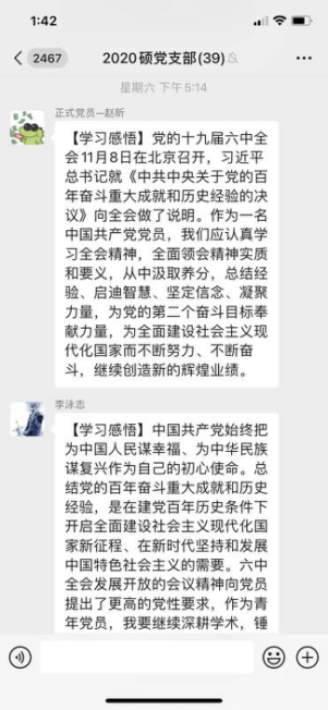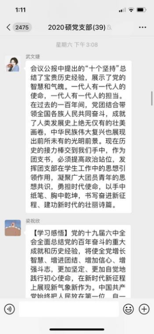 11月19日,2020级硕士生党支部组织开展专题学习活动,共同深入学习贯彻党的十九届六中全会精神,并研讨了习近平总书记关于党的建设、科技创新的重要论述。活动以线上学习分享感悟的方式进行,由党支部书记戴永洁主持,支部全体党员、积极分子参加。