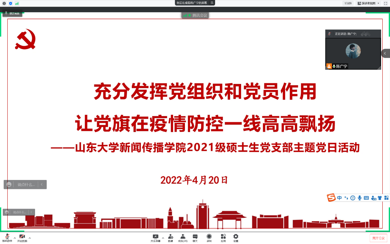 4月20日晚,2021级硕士生党支部围绕“建强‘疫’线战斗堡垒、攻坚克难干事创业”主题开展线上主题党日活动。此次会议应到党员28人,实到党员28人,符合规定人数召开会议。会议由青年委员陈广宁同志主持。