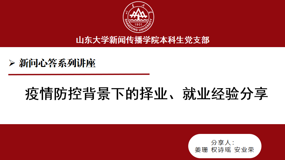 本次讲座围绕疫情背景下择业、就业的相关问题展开分享,由2021届本科毕业生姜珊、权诗瑶、安业荣担任主讲人,内容丰富,逻辑清晰,干货满满,对同学们诸如“如何调整就业心态”“未来如何进行职业选择”等问题进行了答疑解惑。