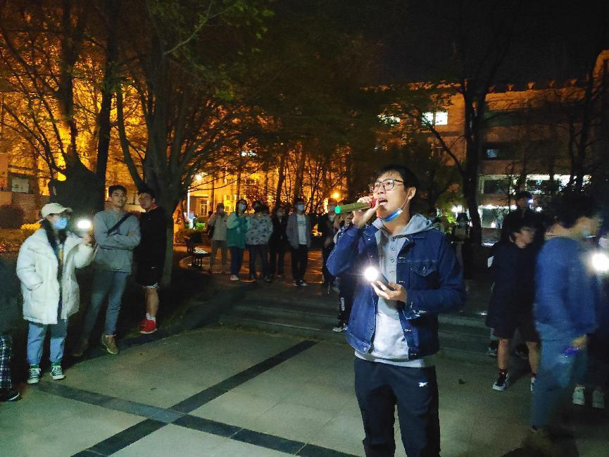 广场K歌心飞扬。为缓解封校期间师生的学习、工作和生活压力,丰富课余生活,入党积极分子周胜龙已经组织开展了5天的“新传小夜场——校园K歌”活动。“起初,我们只是出于自娱自乐的目的,拉着音响去广场唱唱歌。在我们玩的过程中,同学们开始围观,人也越聚越多,大家一边听歌一边开始鼓掌互动,也有越来越多的人鼓起勇气主动参与进来,大家相互交流,彼此欣赏,现场氛围也越发热烈。”他提到,该活动最初由公司爱好唱歌的同学自发组织,后来得到了公司大力支持,拥有了全新的音响设备等。现在经过公司审批后,服务范围已经面向中心校区全体师生员工。周胜龙认为:“歌声能够抚慰人心,积极的交流能缓解消极情绪,K歌会给大家提供了一个释放压力的平台,这点正是它的意义所在。”