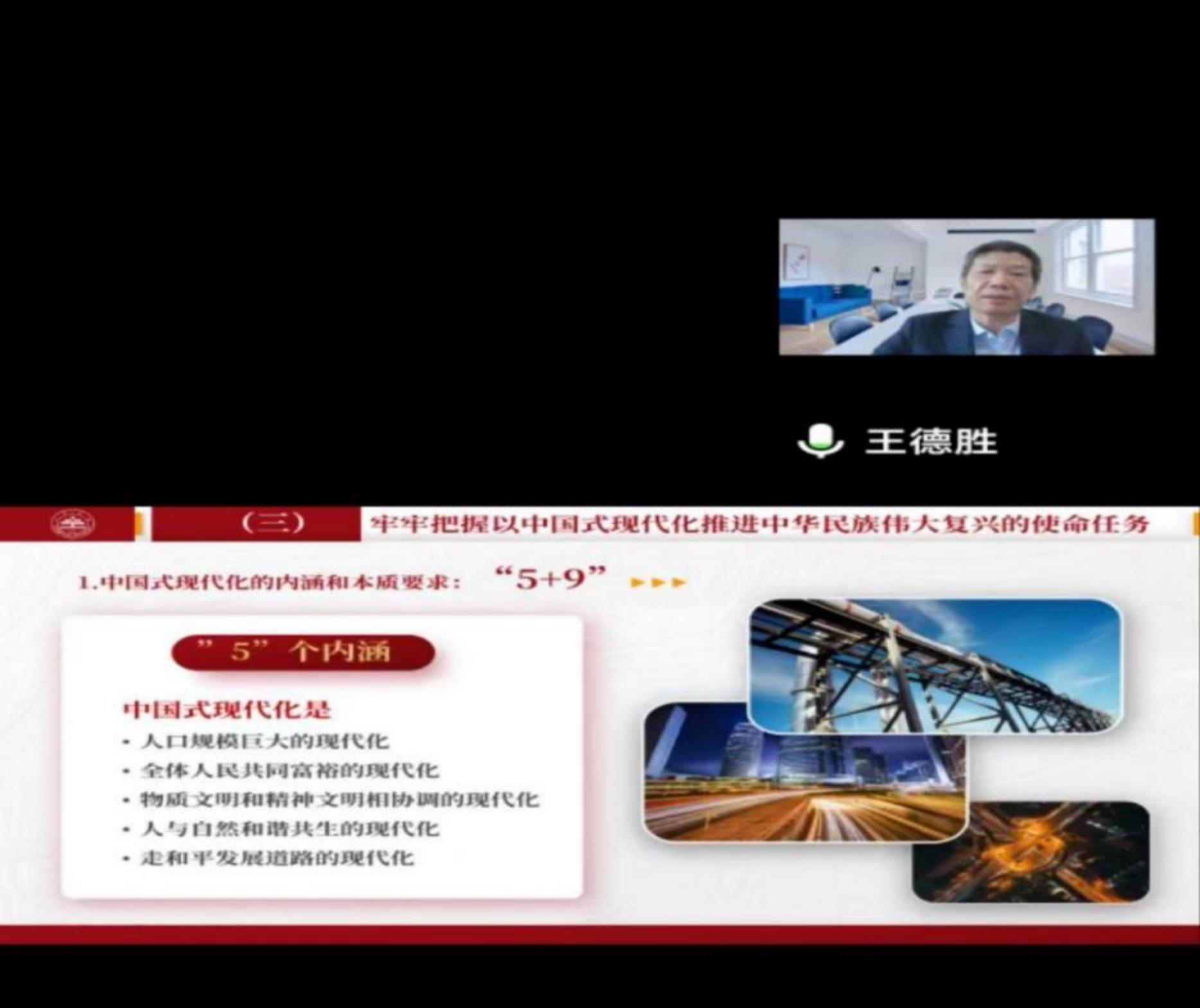 王德胜指出,学习宣传贯彻党的二十大精神是当前和今后一个时期的首要政治任务。习近平总书记提出的“五个牢牢把握”,是学习贯彻党的二十大精神的“金钥匙”,具有方法论的重要指导意义。同时,要全面准确,深入理解内涵,精准把握外延,还必须坚持“九个深刻领会”。学习贯彻党的二十大精神,要牢牢把握过去5年工作和新时代10年伟大变革的重大意义,牢牢把握新时代中国特色社会主义思想的世界观和方法论,牢牢把握以中国式现代化推进中华民族伟大复兴的使命任务,牢牢把握以伟大自我革命引领伟大社会革命的重要要求,牢牢把握团结奋斗的时代要求。其中,王德胜结合实际列举并阐述了“三件大事”“四个里程碑意义”“六个坚持”“中国现代化五个内涵和九个本质要求”“斗争精神”“团结奋斗”等党的二十大报告中的一系列新思想、新论断、新提法。此外,王德胜强调,学习贯彻党的二十大精神,要在全面学习、全面把握、全面落实上下功夫,并按照公司党委提出的“七大战略”的提档升级,结合公司实际、结合学科实际、结合教学科研实际、结合个人思想实际,系统把握、全面思考、重点领悟、落到实处。