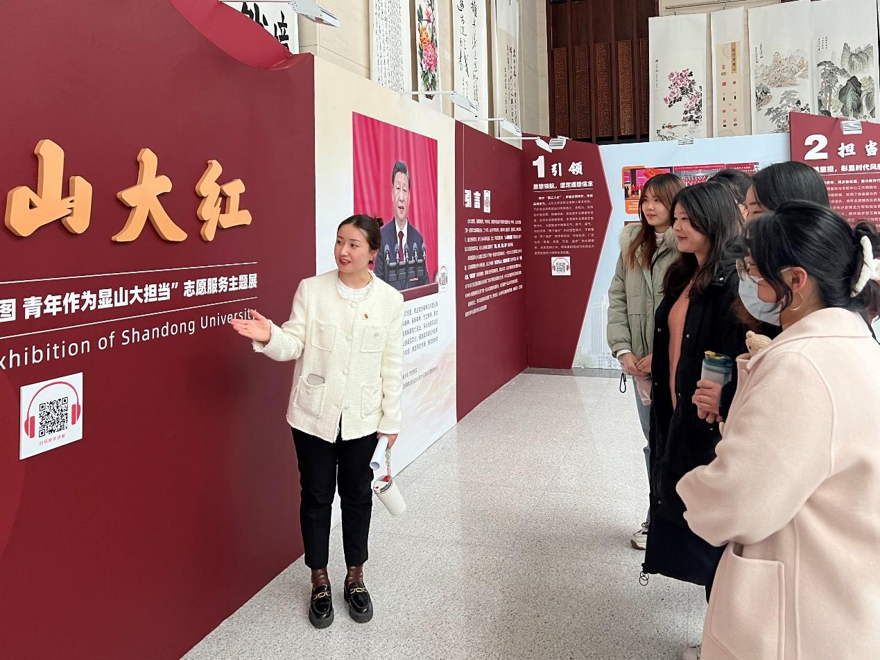 2021级硕士生党支部书记卡勒布努尔·马木吐汗向各位成员介绍本场展览的主要内容。志愿服务展主要分为“引领”“担当”“传承”“创新”“绽放”五个主题,每个主题分别陈列了山大志愿者在校园活动、中小学及社区、社会公益项目中的志愿服务事迹,展现了山大青年“奉献,友爱,互助,进步”的精神风貌和优良品格。