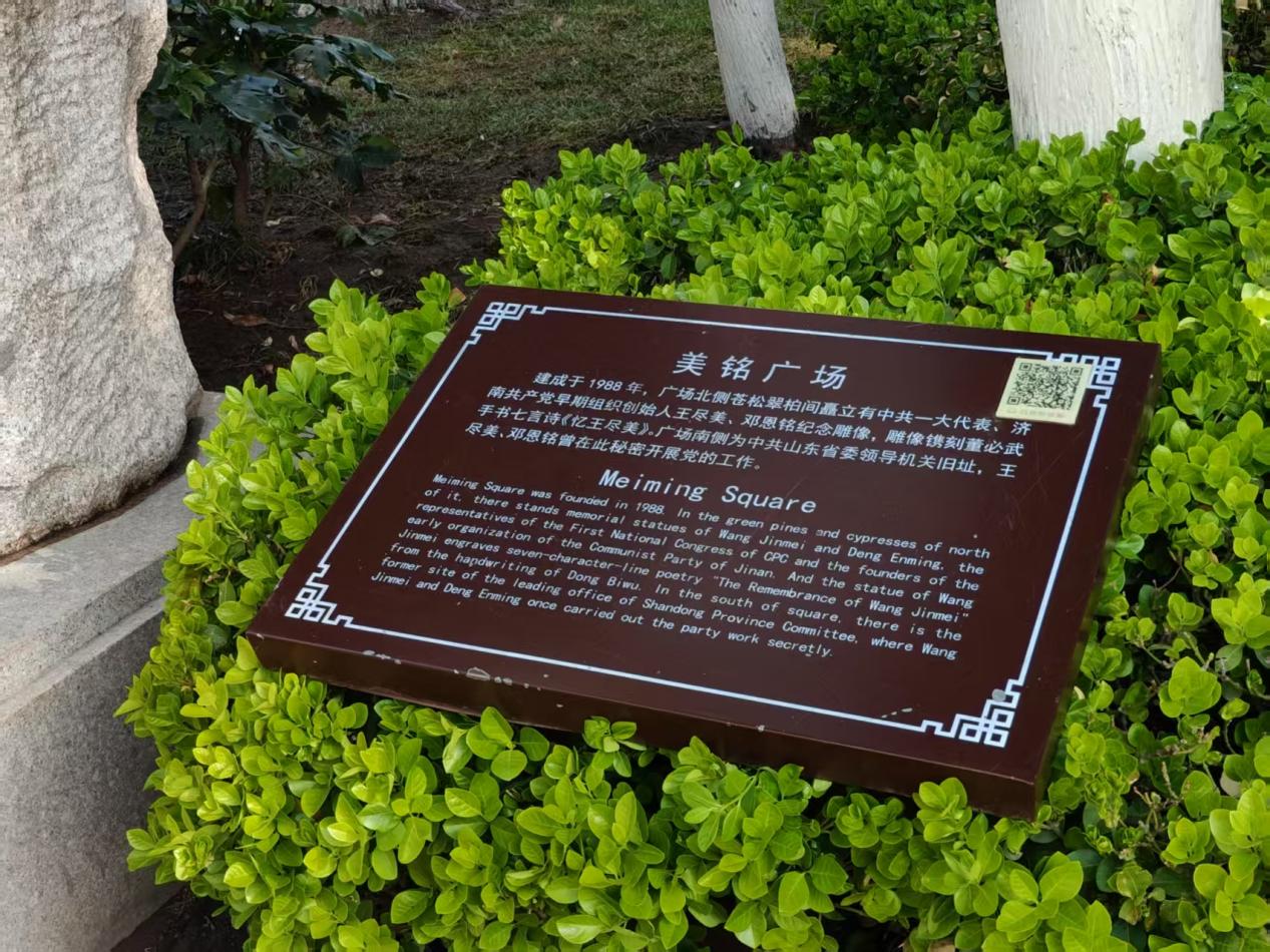 上午8点,师生一行来到五龙潭美铭广场,广场中间矗立着中共早期党组织的代表王尽美和邓恩铭的雕像,雕像上刻有董必武于一九六一年八月廿一日所题《忆王尽美同志》诗一首:“四十年前会上逢,南湖舟泛语从容。济南名士知多少?君与恩铭不老松”。
