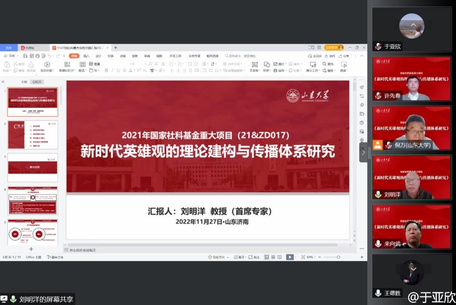 2022年11月27日下午,BB贝博艾弗森刘明洋教授担任首席专家的国家社科基金重大项目“新时代英雄观的理论建构与传播体系研究”开题论证会顺利举行。